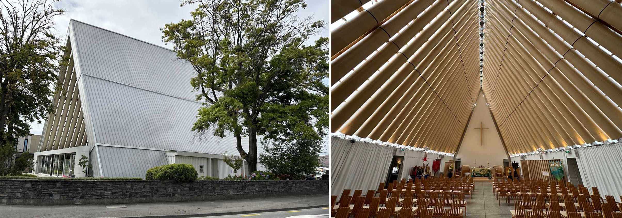 The Cardboard Cathedral is a short-term solution after the destruction of Christchurch Cathedral in the 2011 Earthquake. It has a 50 year lifespan and is constructed out of 98 x 120kg cardboard tubes reinforced with timber and concrete for extra stability.