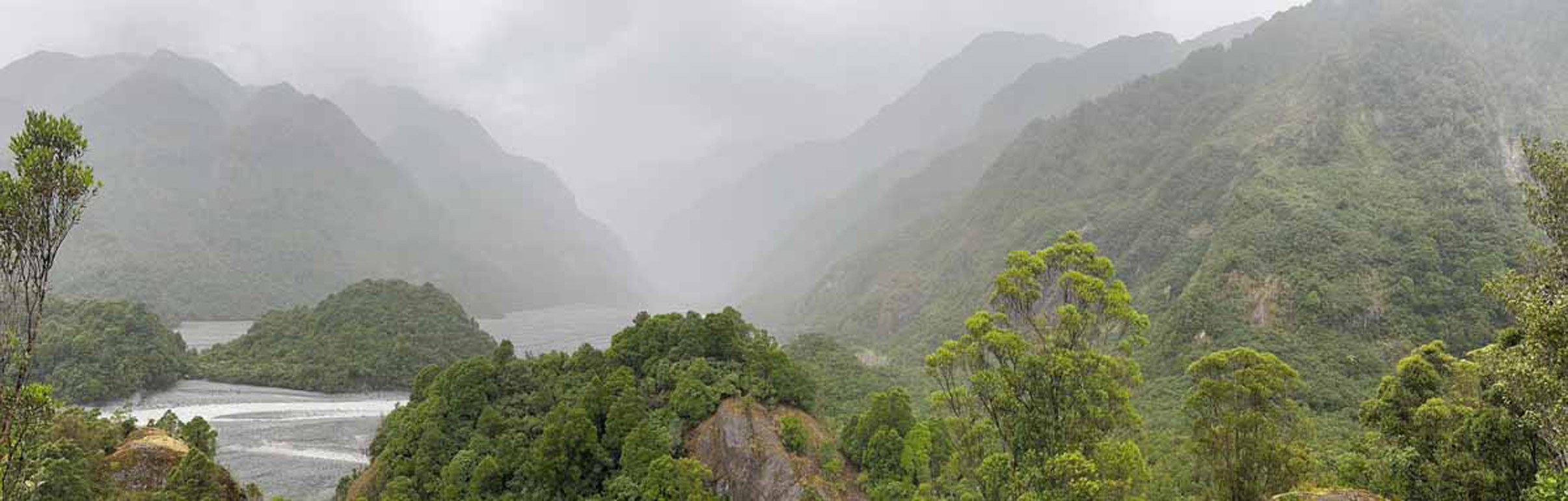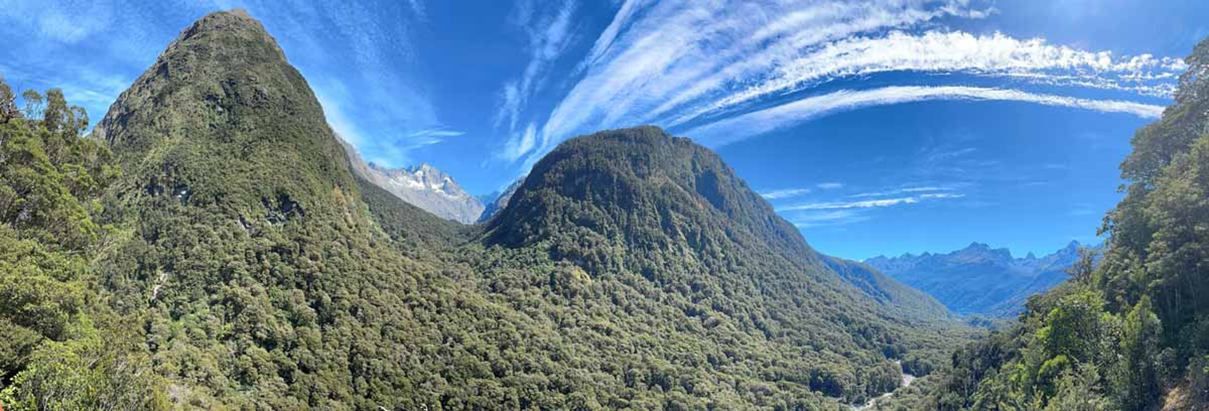 The rugged Hollyford Valley heads north from the route to Milford Sound.