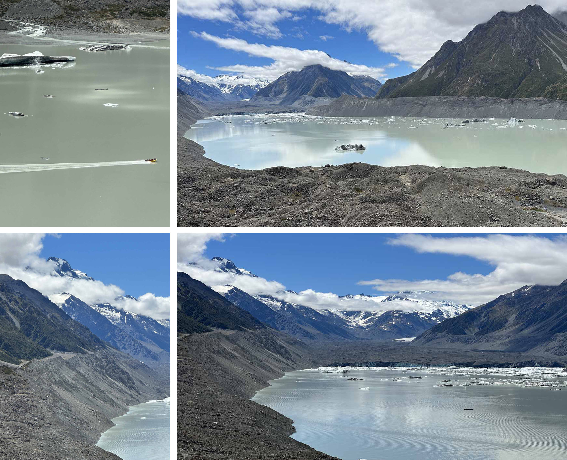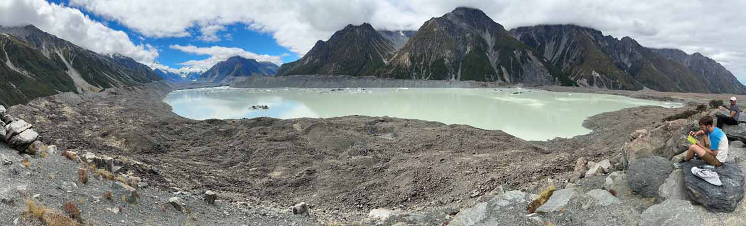 The Tasman Lake and surrounding moraine from the Tasman viewpoint.