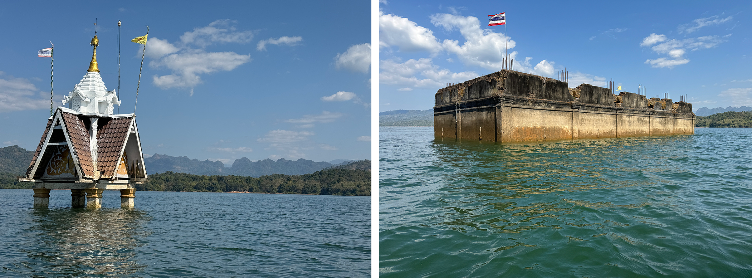The lake is in fact a huge reservoir that was created by the inauguration of the Vajiralongkorn Dam in 1982 which enlarged Khao Laem Lake and in doing so submerged much of the original Sangkhla Buri village! As a result a boat trip on the Lake is an essential ingredient of any visit to Sangkhlaburi and when the water levels are low the tops of submerged temples are revealed.